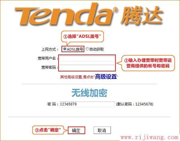 2、“上网方式”选择ADSL——>输入宽带运营商提供的“宽带用户名”和“宽带密码”——>设置“无线密码”——>点击“确定”。